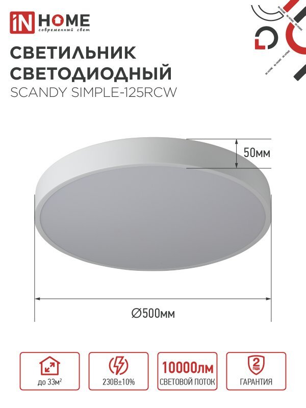 Светильник светодиодный SCANDY SIMPLE-125RCW 125Вт 3000-6500К 10000лм 230В 500х50мм с пультом ДУ бел. IN HOME 4690612058986