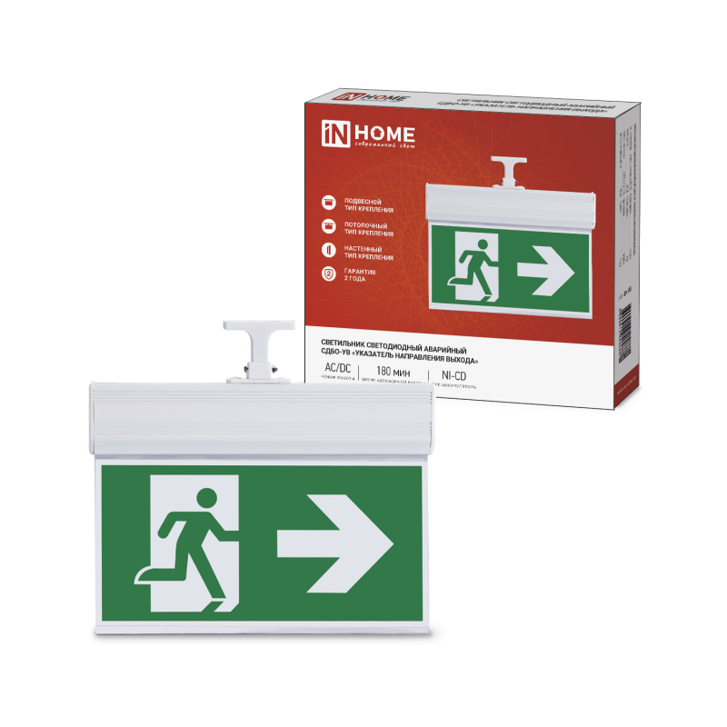 Светильник светодиодный СДБО-УВ "УКАЗАТЕЛЬ НАПРАВЛЕНИЯ ВЫХОДА" 3 часа NI-CD AC/DC аварийный двусторон. IN HOME 4690612040288