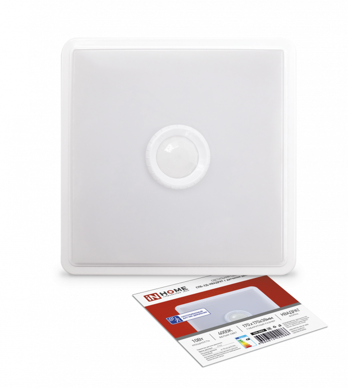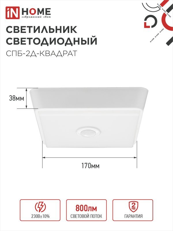 Светильник светодиодный СПБ-2Д-КВАДРАТ 10Вт 4000К 800лм 230В 170мм с датчиком бел. IN HOME 4690612022086