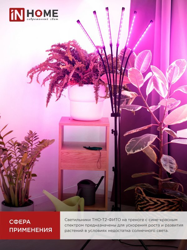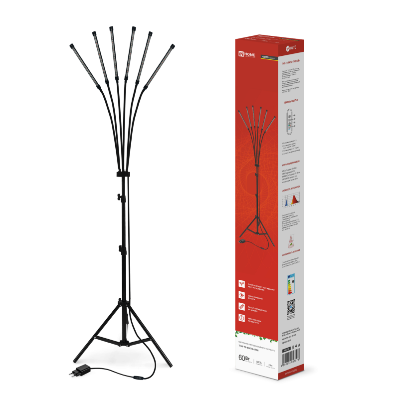 Светильник светодиодный ТНО-Т2-ФИТО 6Т60 60Вт 6 плафонов напольн. на треноге пульт на шнуре черн. IN HOME 4690612053578
