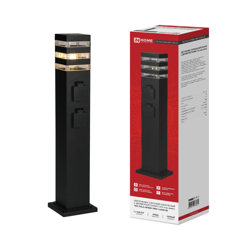 Светильник ТБУ POLO-SP600-2WO-1xA60-BL IP54 600мм уличный напольн. 2 розетки с заземл. контактом черн. IN HOME 4690612061825