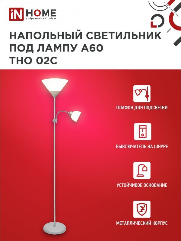 Светильник напольный с двумя плафонами ТНО 02, плафоном основного освещения Е27 и плафоном для чтения Е14, имеет прочный металлический корпус и устойчивое утяжеленное основание. Надежный патрон обеспечивает хороший контакт с цоколем лампы, исключающий окисление. Благодаря сменным лампам вы можете подбирать цветовую температуру и яркость в вашем помещении.