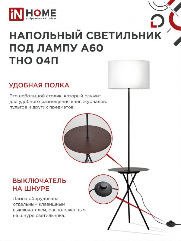 Светильник ТНО 04П-BW 60Вт E27 230В торшер напольн. под лампу на основании с полкой бел. IN HOME 4690612049656