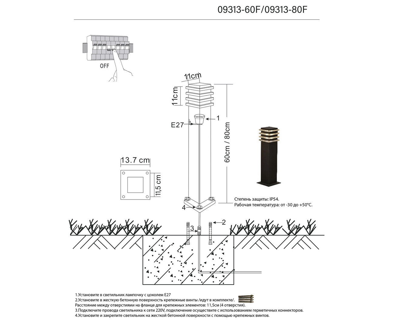 09313-60F,19 Светильник уличный Глари черный w11*11 основание w13,7*13,7 h60 E27 1*60w