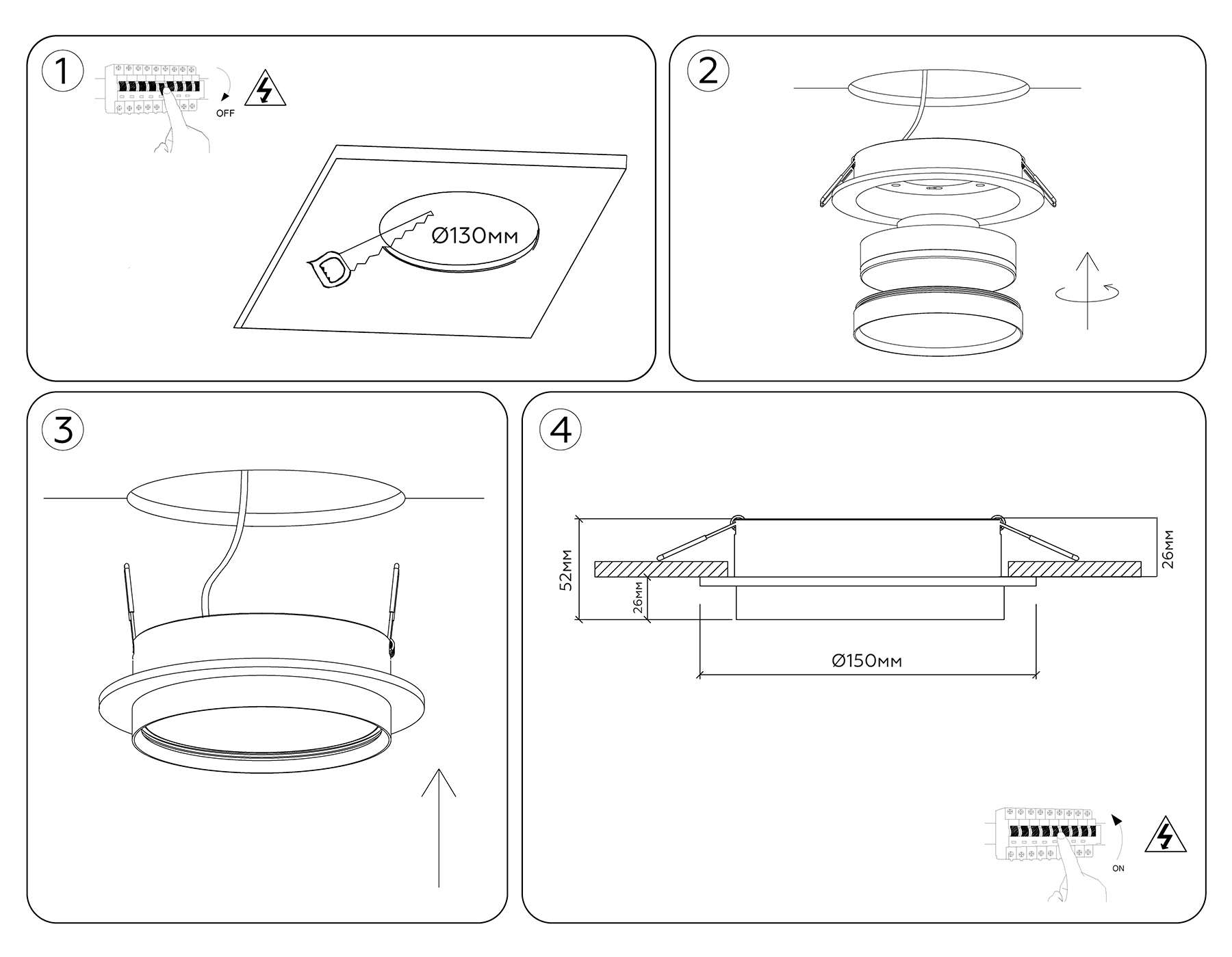Диаметр: 150 Дл: 150 Шир: 150 Высота: 52 Вр. отв: 130 Тип цоколя:GX70 Кол ламп:1