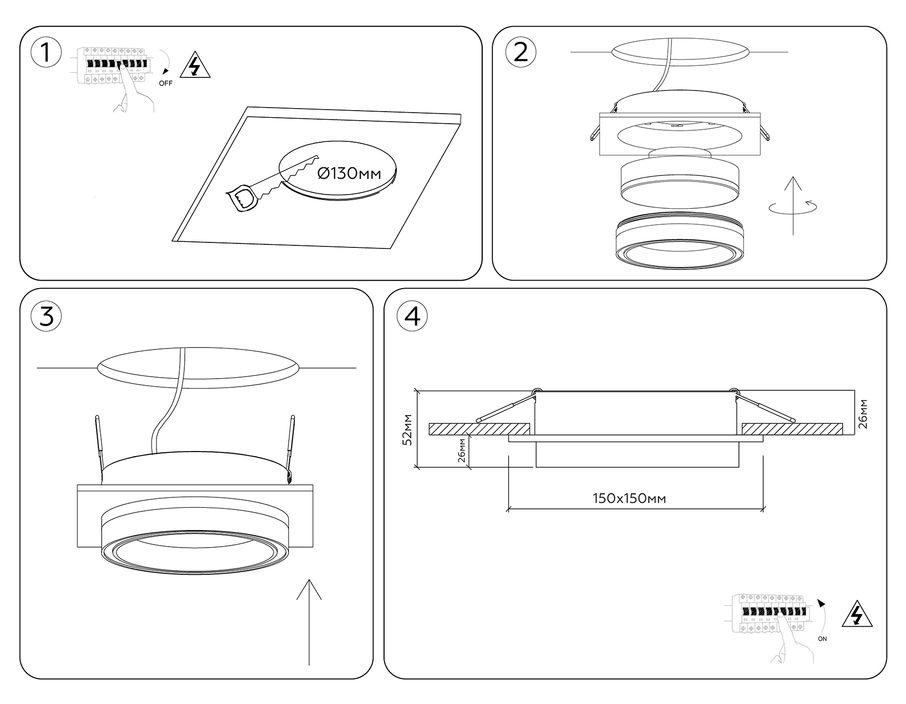 Дл: 150 Шир: 150 Высота: 52 Вр. отв: 130 Тип цоколя:GX70 Кол ламп:1