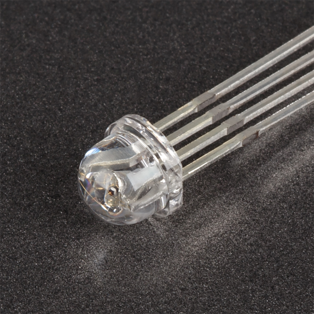 Поставка под заказ от 1000 шт. Выводной круглый светодиод, d=5 мм, прозрачная широкоугольная линза. Цвет свечения RGB: красный (625 нм), зеленый (525 нм), синий (470 нм). Угол излучения 100°. Сила света Iv=600-800 мкд при If=20 мА. VF=1.9-2.4 В (красный). VF=2.9-3.3 В (зеленый/синий). Четыре вывода, общий анод.