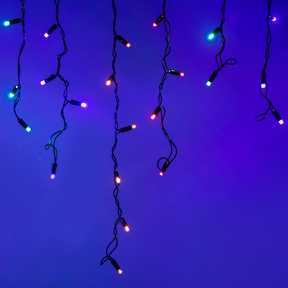 Светодиодная бахрома Classic. Размер 2400 мм (длина 2400 мм, по длине 24 нити высотой 200 / 600 мм). Цвет свечения RGB (цвет светодиодов чередуется), динамические и статические эффекты свечения свечения с резким световым рисунком (прозрачная вогнутая линза). Провод черный, ПВХ. Питание 230 В, Мощность 6 Вт, защита IP65, применение на улице под навесом. Аксессуары для подключения приобретаются отдельно.