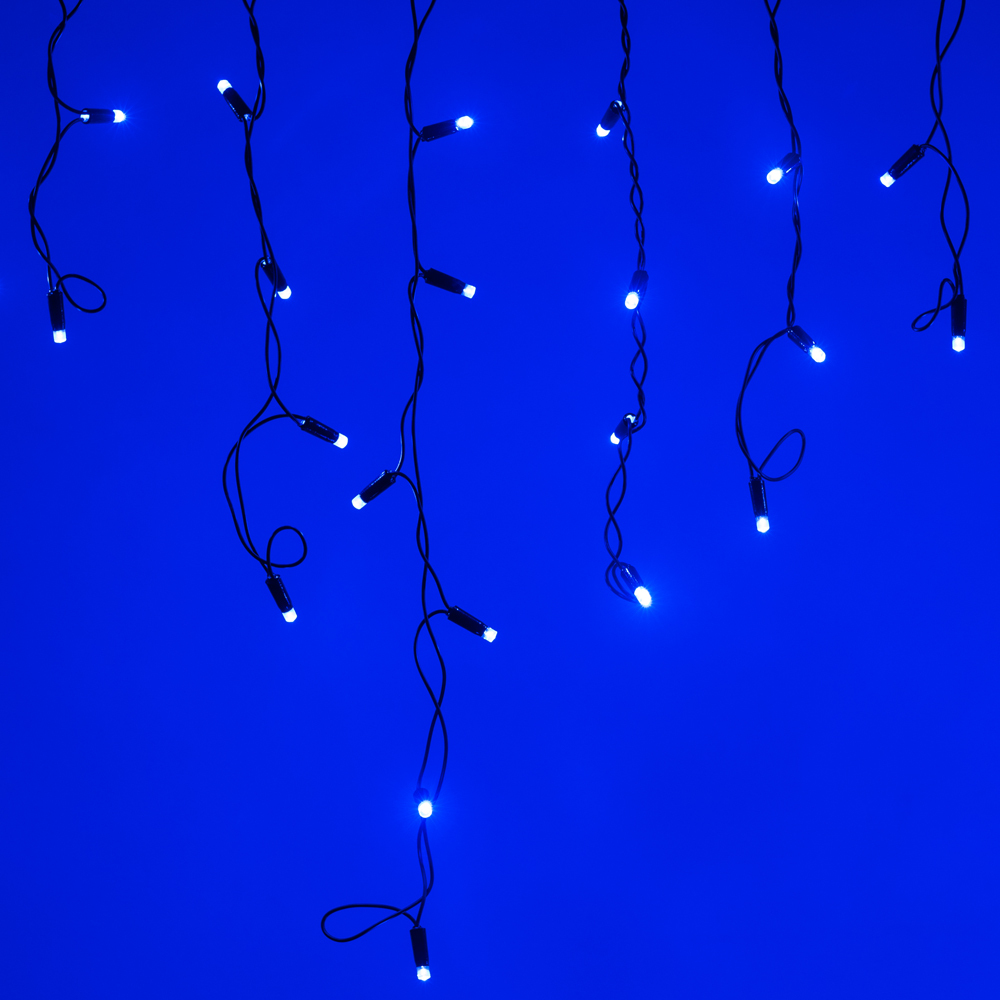 Светодиодная бахрома Classic. Размер 2400x600 мм (длина 2400 мм, по длине 24 нити высотой 200/600 мм). Количество светодиодов 88 размером 7 мм. Цвет свечения СИНИЙ, эффект постоянного свечения с резким световым рисунком (прозрачная вогнутая линза). Провод черный, ПВХ. Питание 230 В, Мощность 6 Вт, защита IP65, применение на улице под навесом. Аксессуары для подключения приобретаются отдельно.