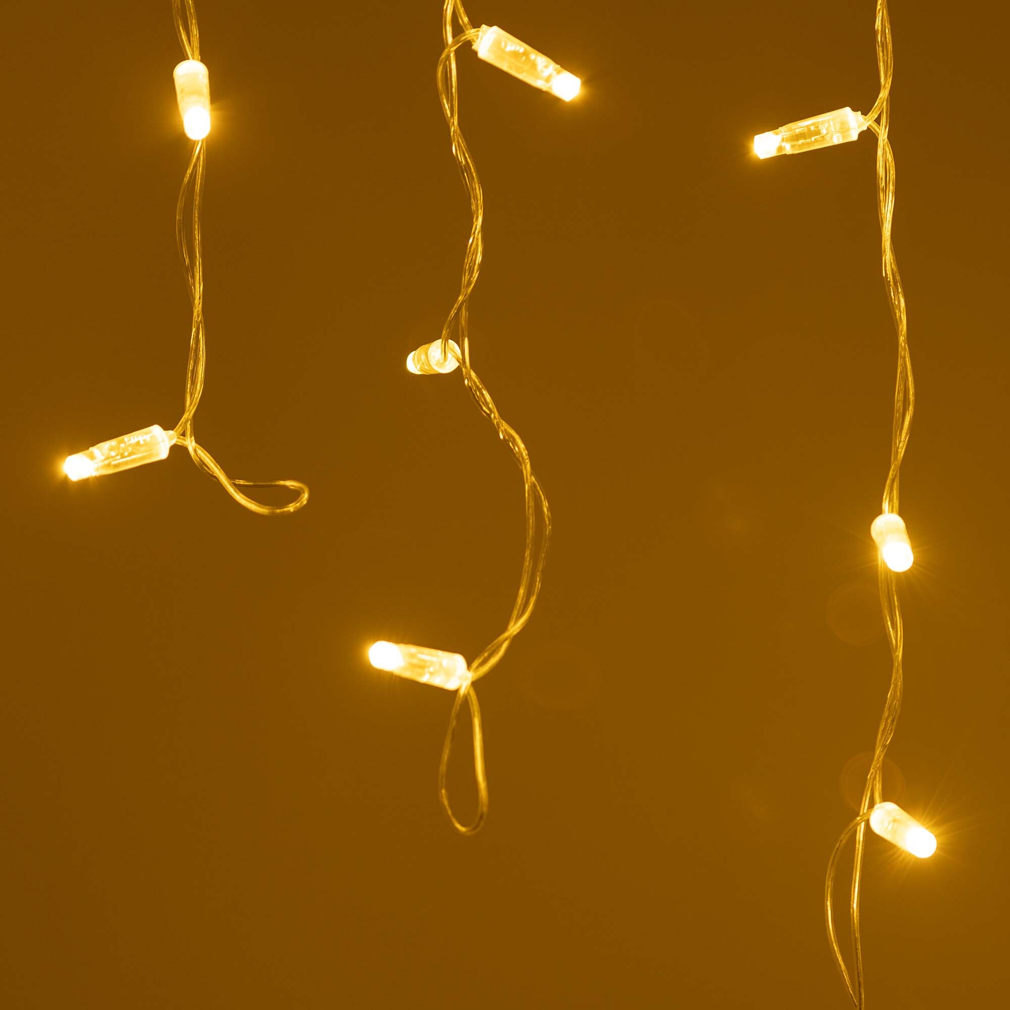 Светодиодная бахрома Classic. Размер 2400 мм (длина 2400 мм, по длине 24 нити высотой 200/600 мм). Количество светодиодов 88 шт размером 7 мм. Основной цвет свечения ТЕПЛЫЙ БЕЛЫЙ (3000 К), эффект мерцания редких точек (ТЕПЛЫЙ БЕЛЫЙ 3000К) с мягким световым рисунком (выпуклая молочно-белая линза), соотношение светодиодов: 66 теплых постоянного свечения / 12 теплых с мерцанием. Эффект частого мерцания. Провод прозрачный, ПВХ. Питание 230 В, Мощность 6 Вт, защита IP65, применение на улице под навесом. Аксессуары для подключения приобретаются отдельно.