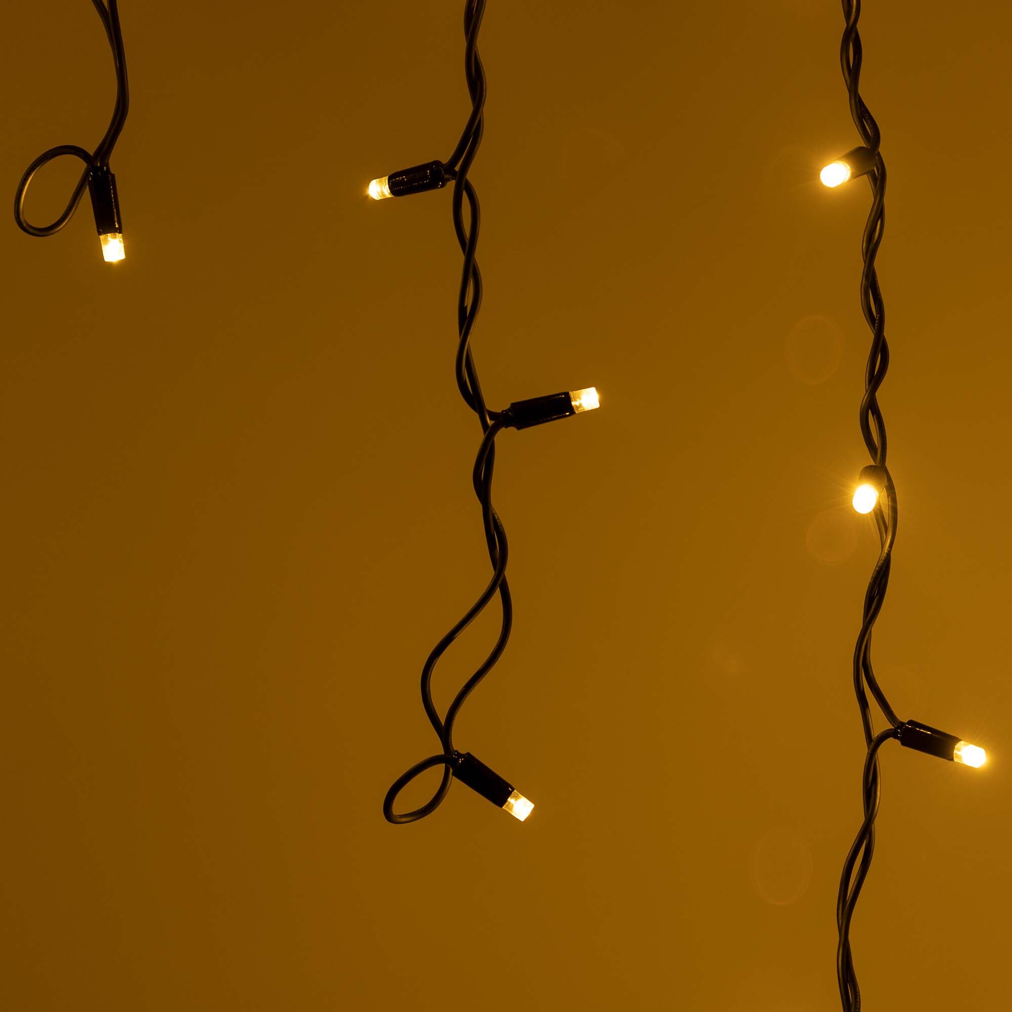 Светодиодная бахрома Pro. Размер 4000 мм (длина 4000 мм, по длине 32 нити высотой 200/600 мм). Количество светодиодов 128 шт размером 7 мм. Основной цвет свечения ТЕПЛЫЙ БЕЛЫЙ (3000 К), эффект мерцания редких точек ТЕПЛЫЙ БЕЛЫЙ (3000К) с мягким световым рисунком (выпуклая молочно-белая линза), соотношение светодиодов: 106 теплых постоянного свечения / 22 теплых с мерцанием. Эффект частого мерцания. Провод черный, каучук. Питание 230 В, Мощность 6 Вт, защита IP65, применение на улице под навесом. Аксессуары для подключения приобретаются отдельно.