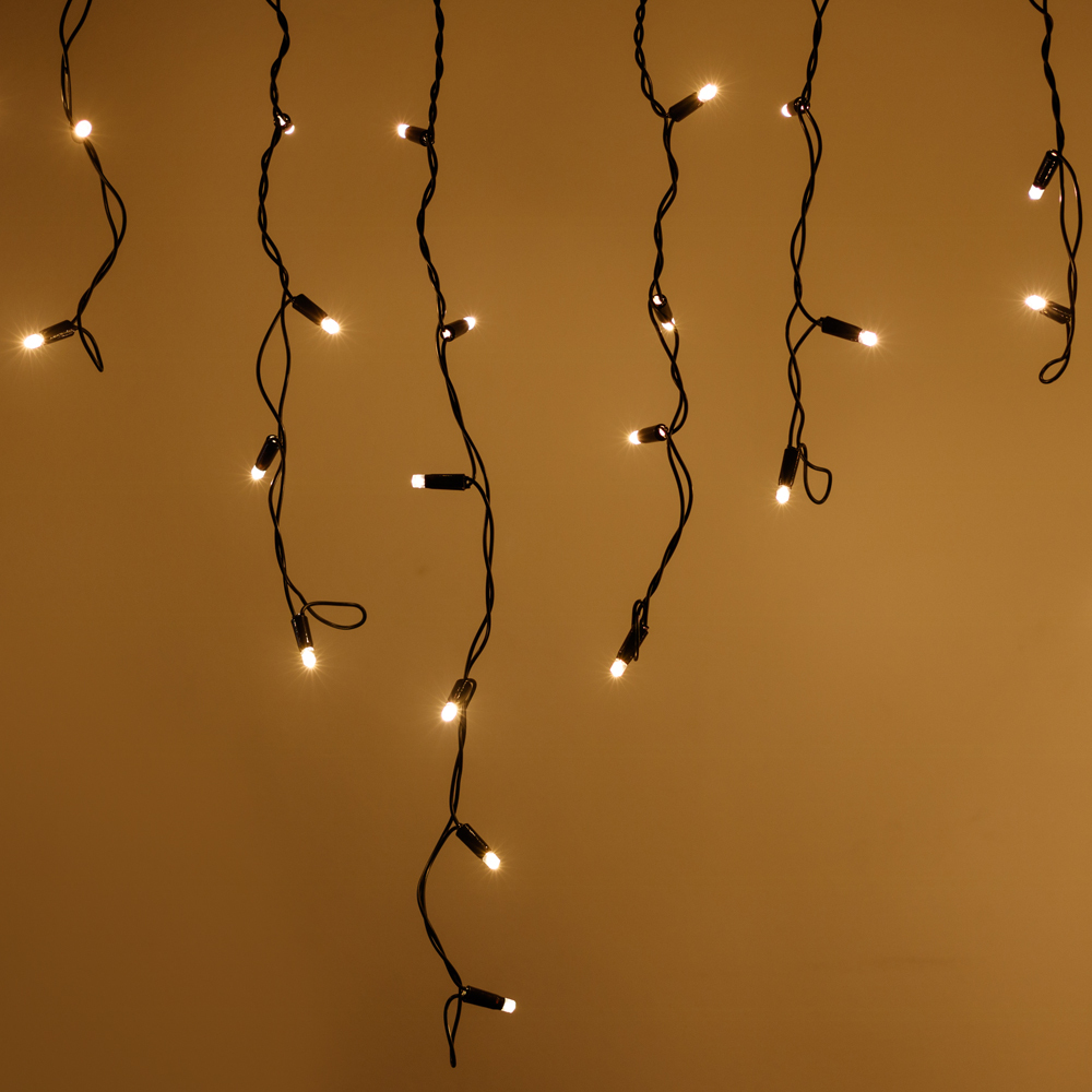 Светодиодная бахрома Pro. Размер 4000x600 мм (длина 4000 мм, по длине 32 нити высотой 200/600 мм). Количество светодиодов 128 шт размером 7 мм. Цвет свечения ТЕПЛЫЙ БЕЛЫЙ (3000 К), эффект постоянного свечения с резким световым рисунком (прозрачная вогнутая линза). Провод черный, резиновый. Питание 230 В, Мощность 8 Вт, защита IP65, применение на улице под навесом. Аксессуары для подключения приобретаются отдельно.