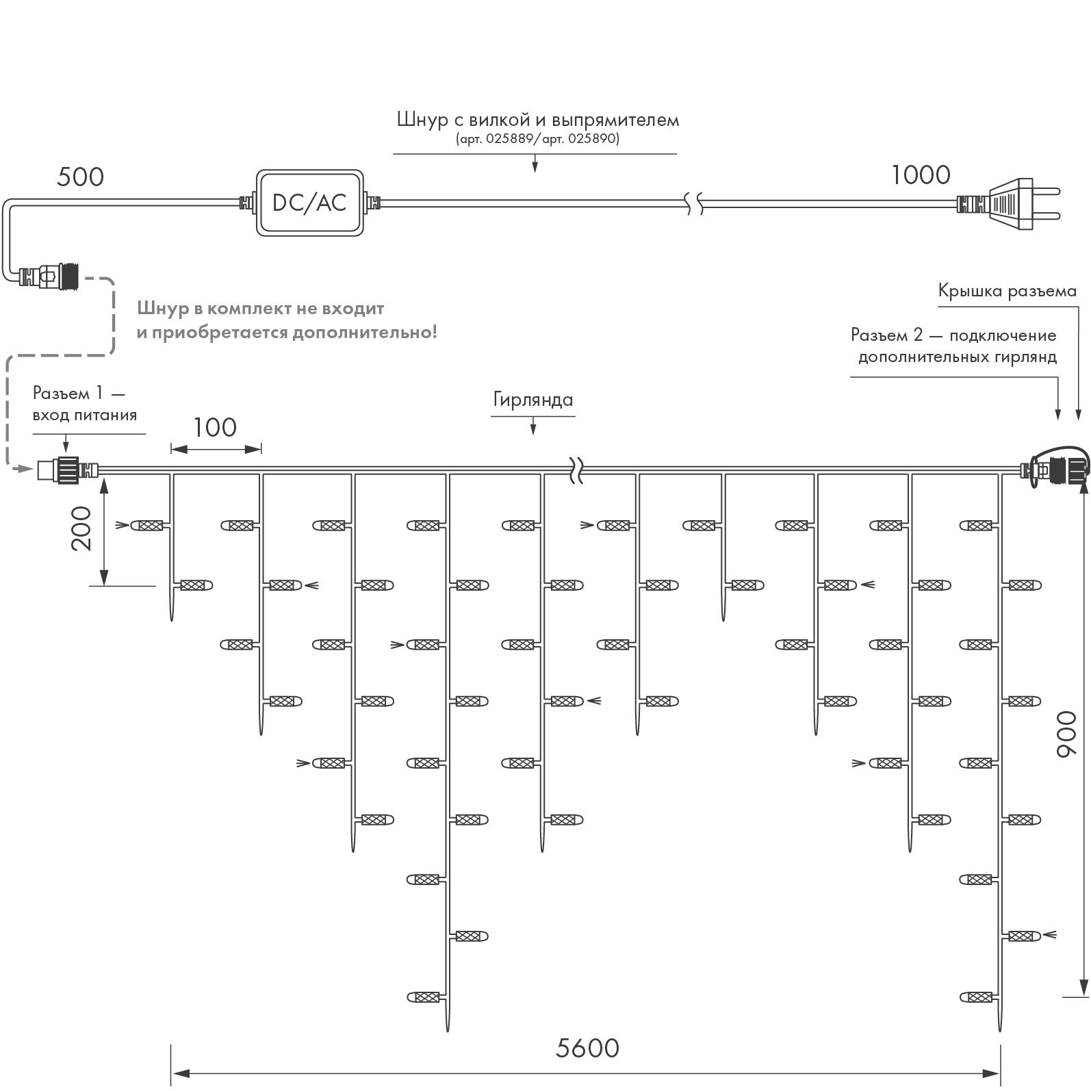 Светодиодная бахрома Pro. Размер 5600 мм (длина 5600 мм, по длине 48 нитей высотой 200/900 мм). Количество светодиодов 240 шт размером 7 мм. Основной цвет свечения ТЕПЛЫЙ БЕЛЫЙ (3000 К), эффект мерцания редких точек БЕЛЫЙ (6000К) с мягким световым рисунком (выпуклая молочно-белая линза), соотношение светодиодов: 198 теплых постоянного свечения / 42 белых с мерцанием. Эффект частого мерцания. Провод черный, каучук. Питание 230 В, Мощность 6 Вт, защита IP65, применение на улице под навесом. Аксессуары для подключения приобретаются отдельно.