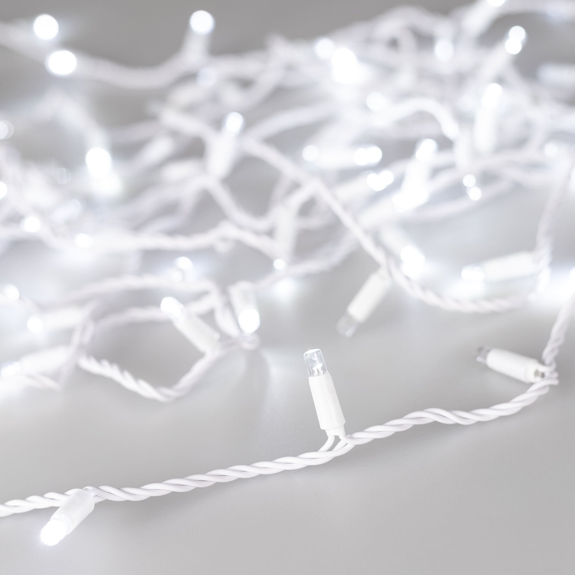 Светодиодная нить Classic. Размер 10000 мм. Цвет свечения БЕЛЫЙ (6000 К). 100 светодиодов размером 7 мм с эффектом медленного мерцания каждого светодиода с резким световым рисунком (прозрачная вогнутая линза). Провод белый, ПВХ. Питание 230 В, Мощность 7 Вт, защита IP65, применение в помещении и на улице под навесом. Аксессуары для подключения и управления приобретаются отдельно.