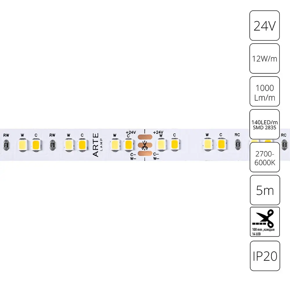 Светодиодная лента 24V 12W/m mix 2700-6000К 5м Arte Lamp TAPE A2414010-01-mix, LED