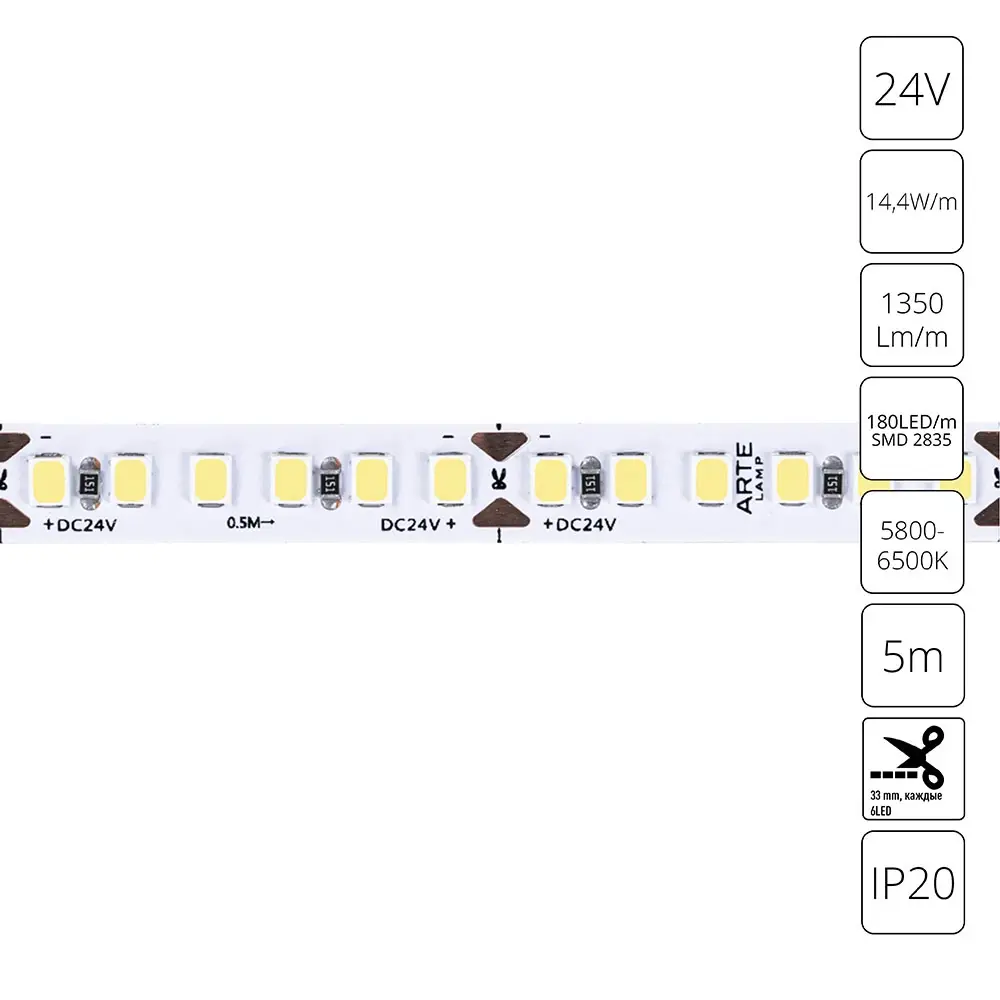 Светодиодная лента 24V 14,4W/m 6000К 5м Arte Lamp TAPE A2418008-03-6K, LED