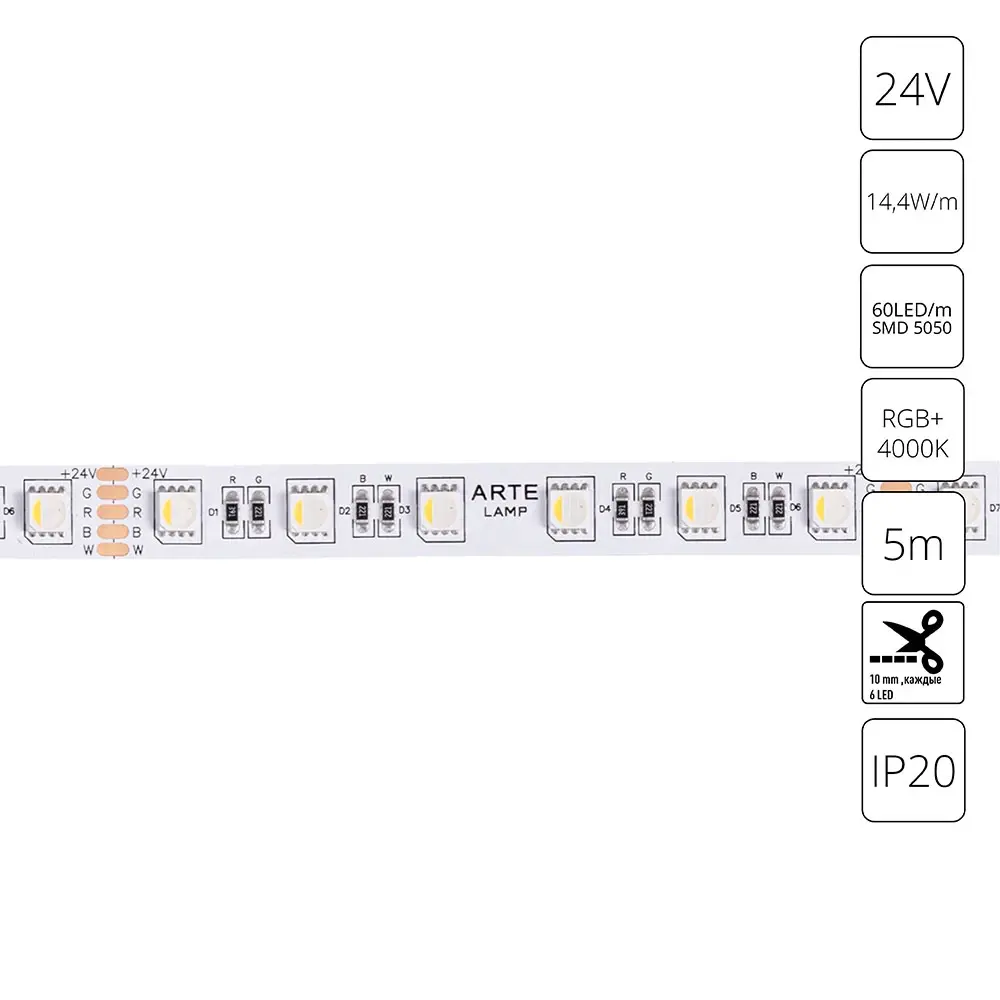 Светодиодная лента 24V 14,4W/m RGB+W 4000К 5м Arte Lamp TAPE A2406012-01-RGB4K, LED