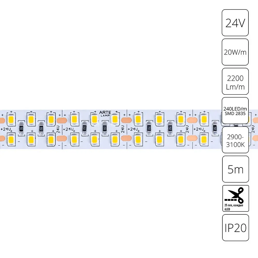 Светодиодная лента 24V 20W/m 3000К 5м Arte Lamp TAPE A2424015-01-3K, LED