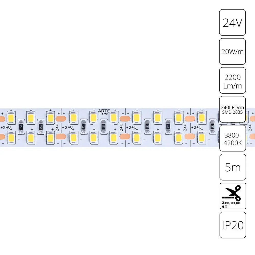 Светодиодная лента 24V 20W/m 4000К 5м Arte Lamp TAPE A2424015-02-4K, LED