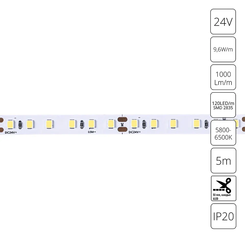 Светодиодная лента 24V 9,6W/m 6000К 5м Arte Lamp TAPE A2412008-03-6K, LED