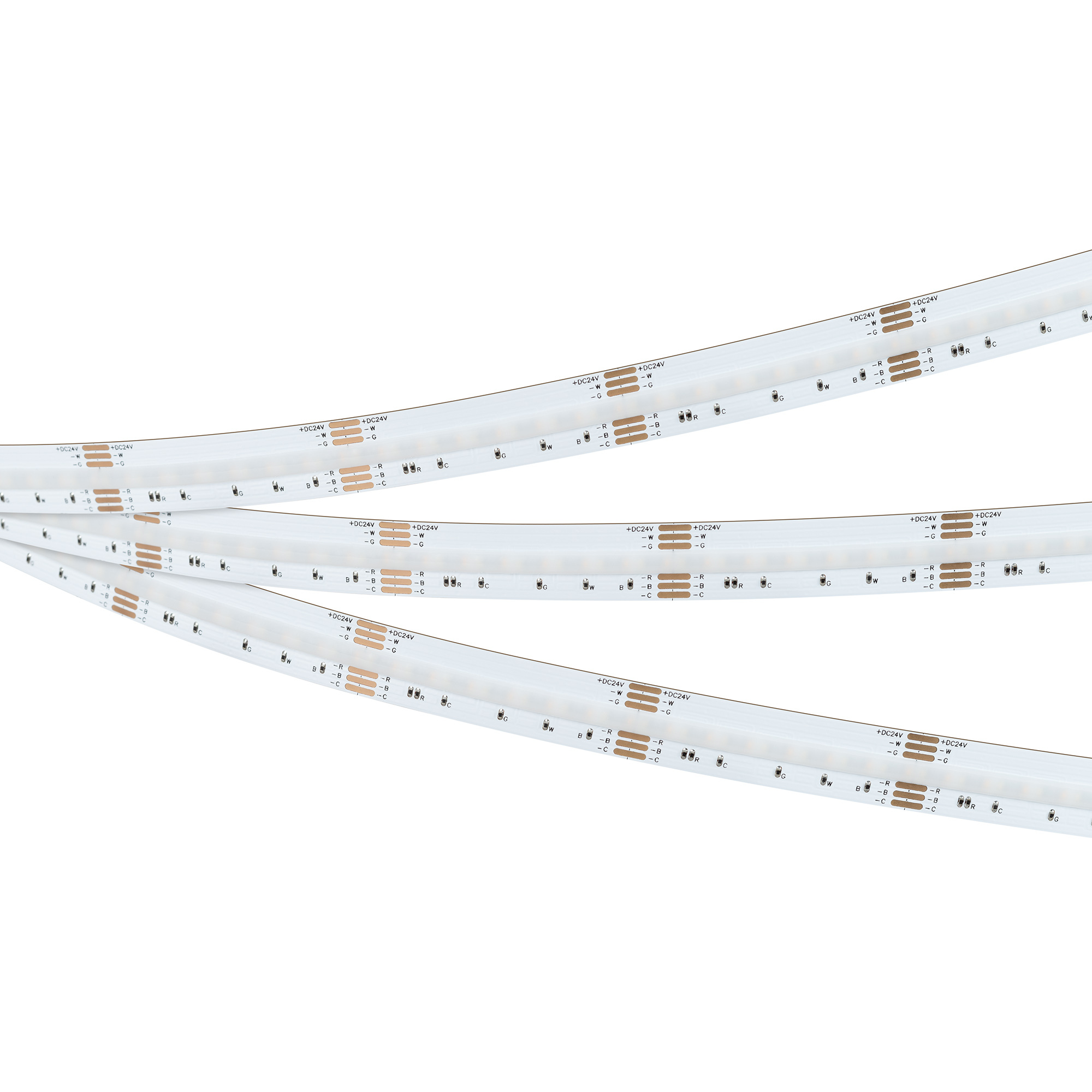 Светодиодная лента сплошного свечения COB серии X840. Светодиоды CSP, 840 шт/м, белая плата шириной 12 мм, скотч 3M. Цвет RGB + MIX ТЕПЛЫЙ 2700K/БЕЛЫЙ 6000K, индекс цветопередачи CRI>90, угол 160°. Питание 24 В, мощность 16 Вт/м (80 Вт на 5 м). Размеры 5000x12x1.8 мм. Мин. отрезок 41.6 мм. Цена за 1 м. Обязательна установка на профиль.