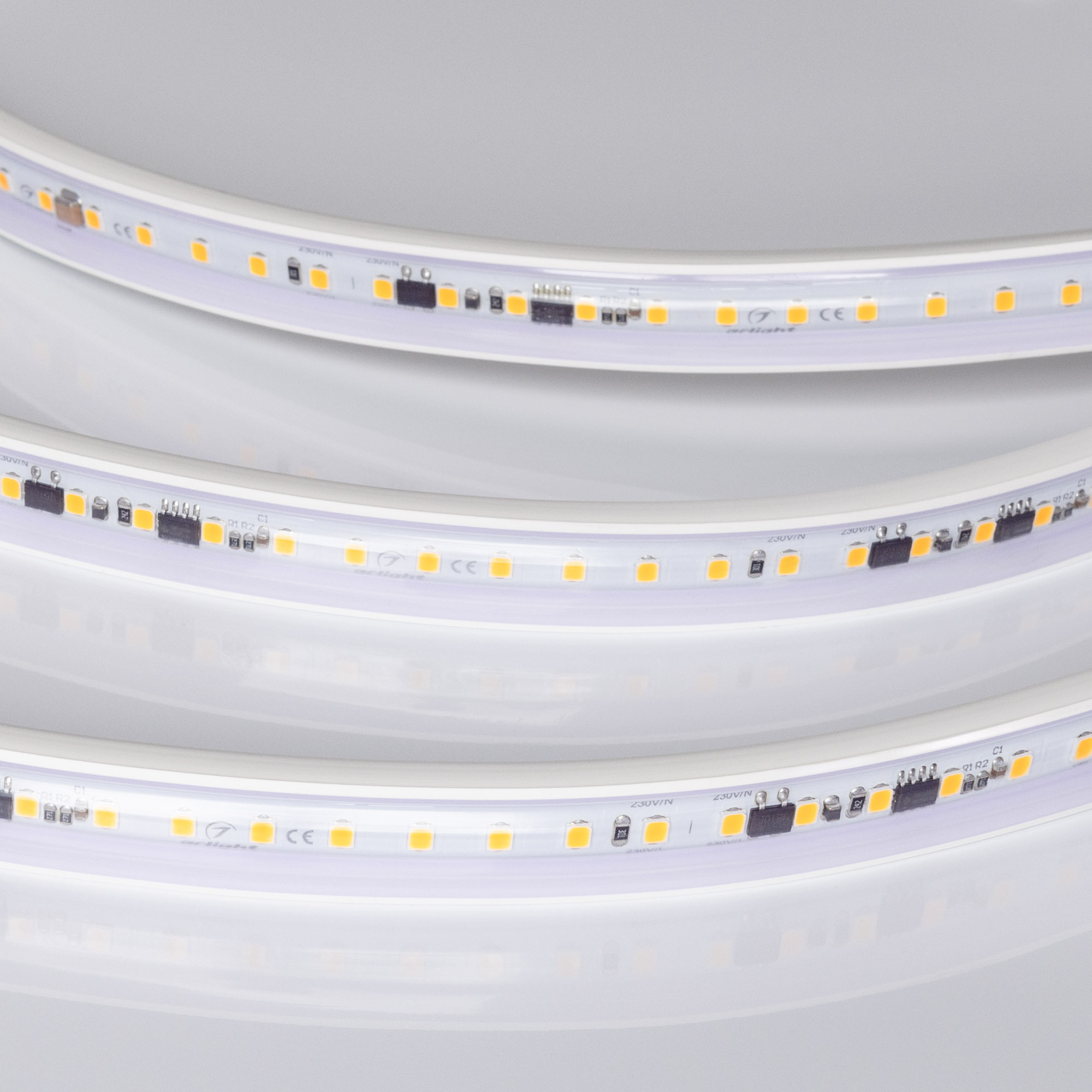 Поставка под заказ от 100 м. Светодиодная герметичная лента ARL серии A120, IP65 (PVC - трубка ПВХ экструзия). Светодиоды SMD 2835, 120 шт/м, белая плата шириной 12 мм, крепление на силиконовые скобы (скотч 3M отсутствует). Цвет ТЕПЛЫЙ 2700K, индекс цветопередачи CRI>85, угол 120°. Питание 230 В, мощность 15 Вт/м (150 Вт на 10 м). Размеры 10000x15x6.5 мм. Мин. отрезок 100 мм, 12 светодиодов. Цена за 1 м.