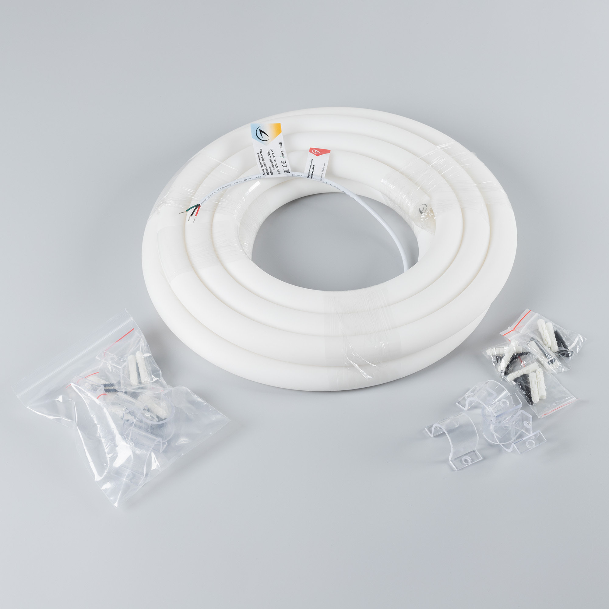 Гибкая герметичная лента (неон серии MOONLIGHT), сечение 25×25 мм. Светодиоды SMD 2216 768 шт/м. Цвет свечения MIX (2300K-4000K), индекс цветопередачи CRI>90, световой поток 950 лм/м, угол излучения 360°. Мощность 14.4 Вт/м, питание 24 В. Класс пылевлагозащиты IP65. Размеры 5000×25×25 мм. Резка не предусмотрена. Изгиб согласно метки на корпусе, минимальный радиус изгиба 120 мм. Кабель питания длиной 500 мм, вывод с одной стороны вдоль линии сечения неона. Катушка 5 м. Цена за 1 м. Гарантия 3 года.