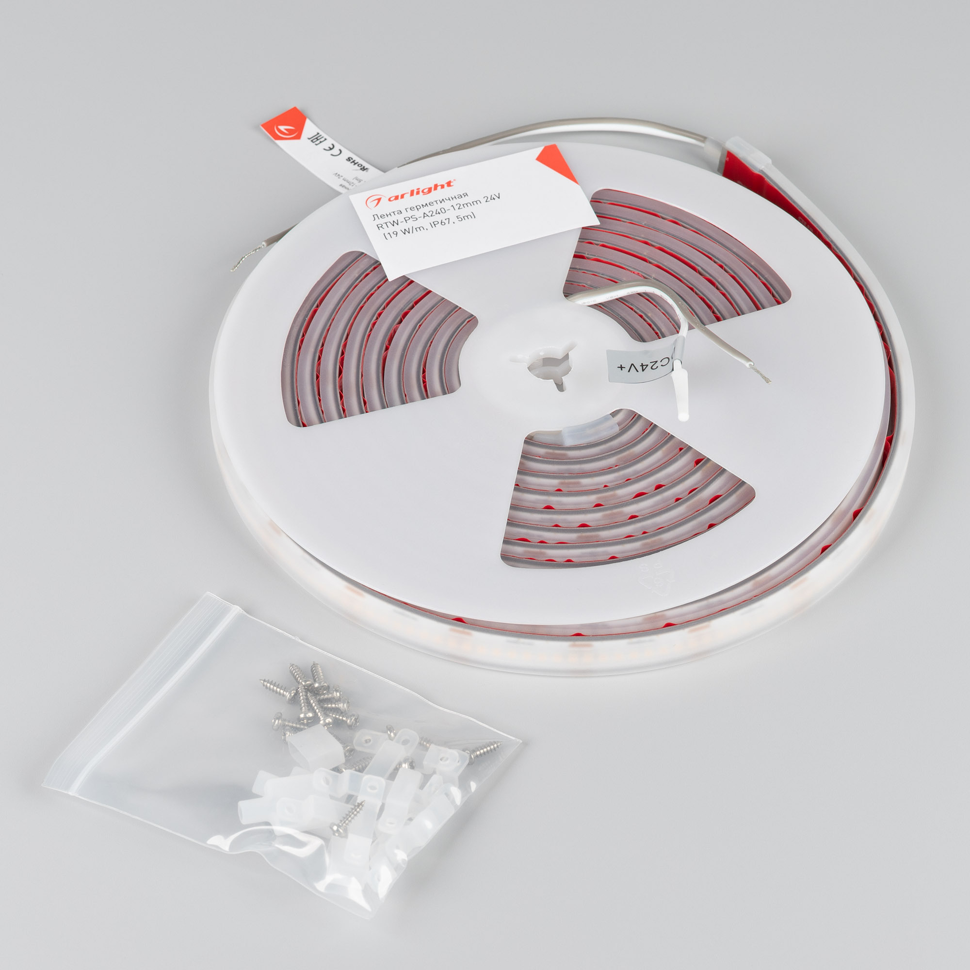 Светодиодная герметичная лента RTW серии A240, IP67 (PS - силиконовая экструзия). Светодиоды SMD 2835, 240 шт/м, белая плата шириной 10 мм, скотч 3M. Цвет ТЕПЛЫЙ 3000K, индекс цветопередачи CRI>90, угол 120°. Питание 24 В, мощность 19 Вт/м (95 Вт на 5 м). Размеры 5000x12x5 мм. Мин.отрезок 33.33 мм, 8 светодиодов. Цена за 1 м. Обязательная установка на профиль.