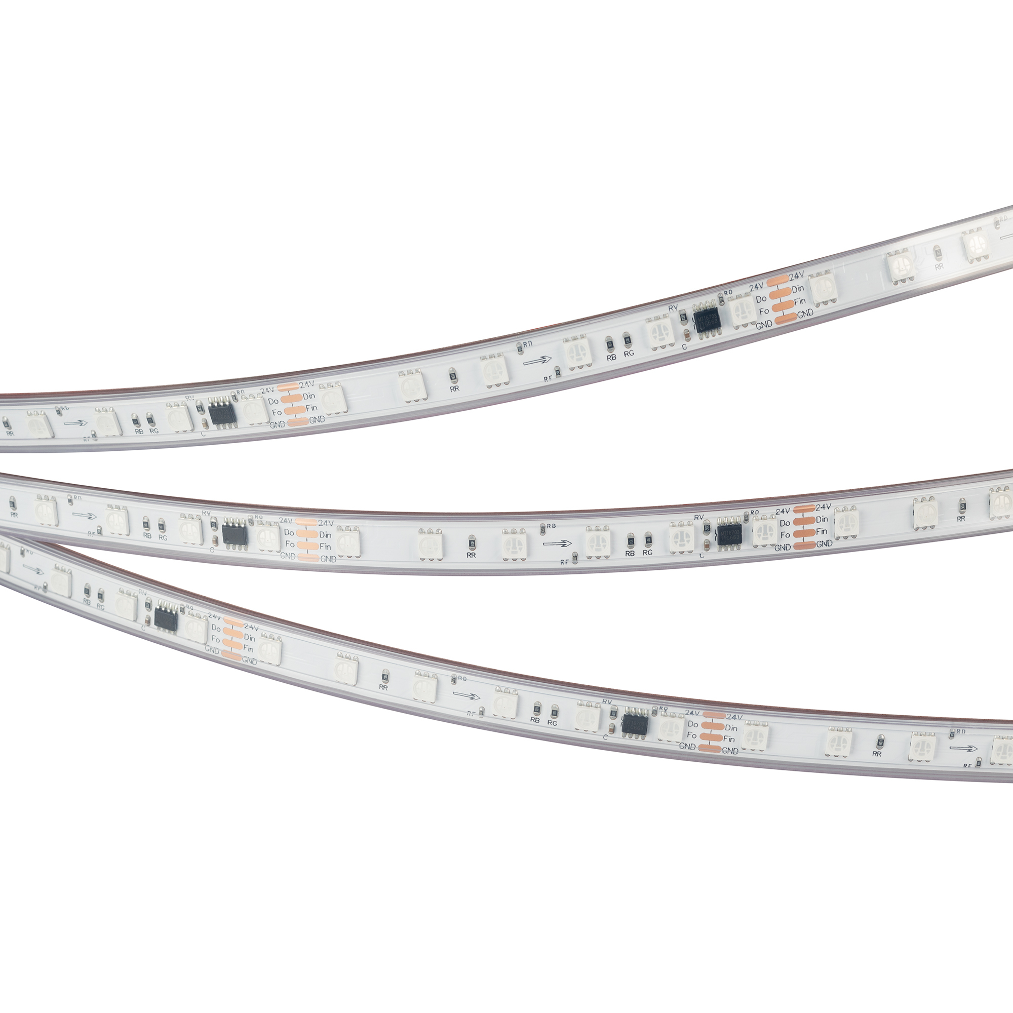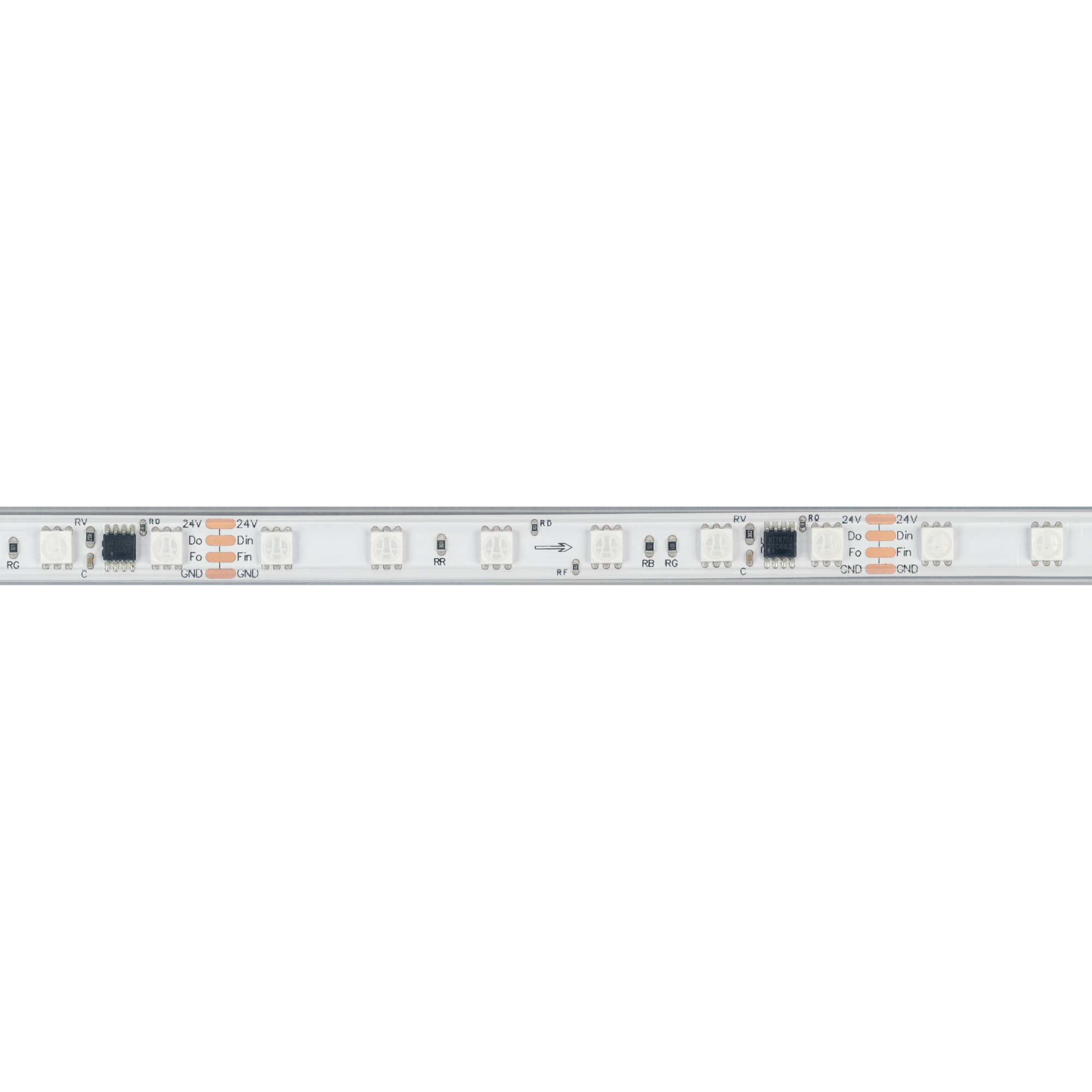 Светодиодная герметичная лента SPI серии B60 с микросхемой MT1808A, IP67 (PS - силиконовая экструзия). Светодиоды SMD 5060, 60 шт/м, 10 pixels на 1 м (50 pixels на 5 м), 1 pixel = 6 светодиодов, белая плата шириной 10 мм, скотч 3М. Цвет RGB, угол 120°. Питание 24 В, мощность 12 Вт/м (60 Вт на 5 м). Размеры 5000x12x5 мм. Мин. отрезок 100 мм, 6 светодиодов. Цена за 1 м.