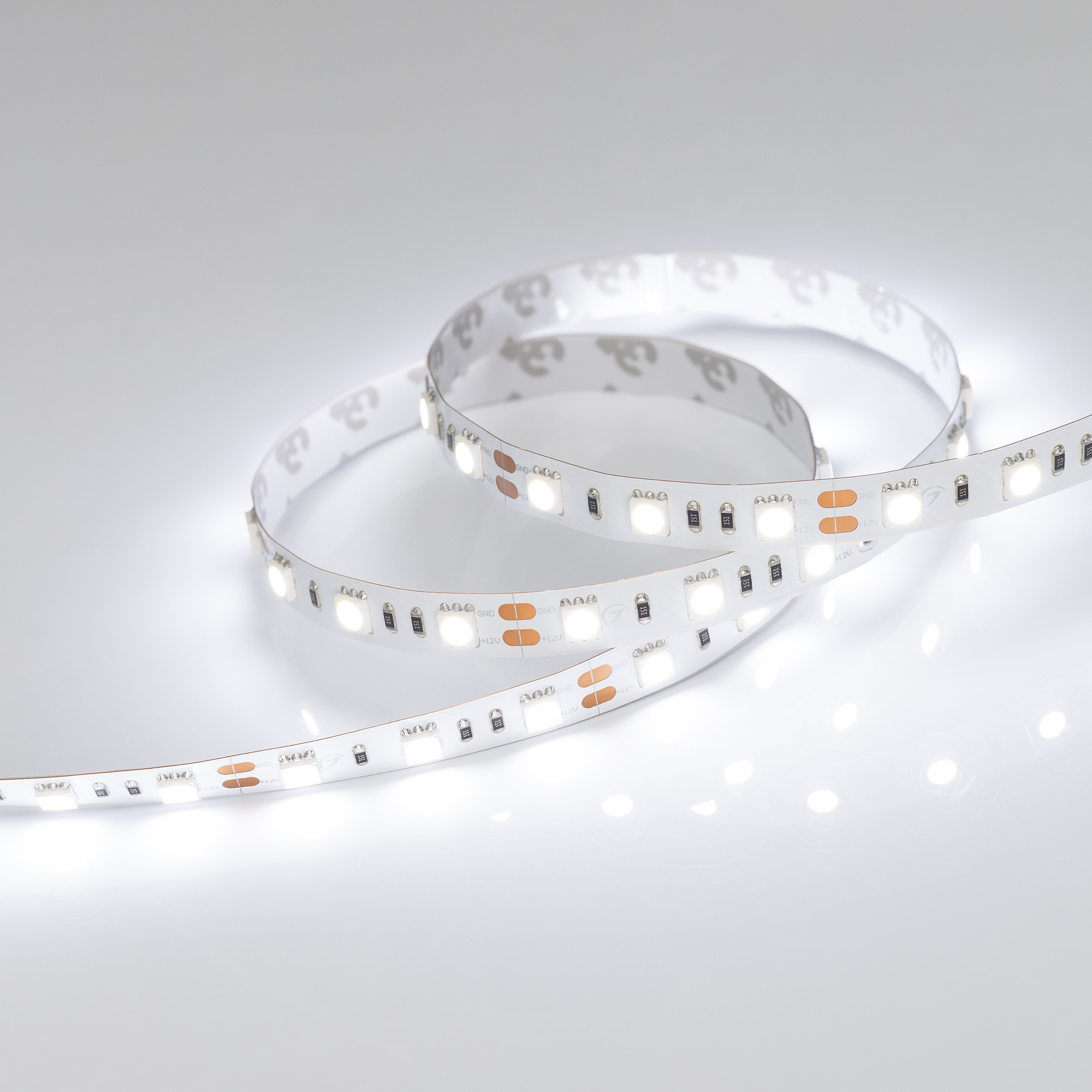 Гибкая лента LUX, светодиоды smd 5060, 60шт/м (300шт на 5м), белая плата 10мм, скотч 3М. Цвет БЕЛЫЙ 5800-6500K. Питание 12V, мощность 14.4 Вт/м (72 Вт на 5м), угол 120°, цветопередача CRI>85. Размеры 5000х10x2.2мм. Мин.отрезок 50мм, 3 светодиода. Цена за 1м.