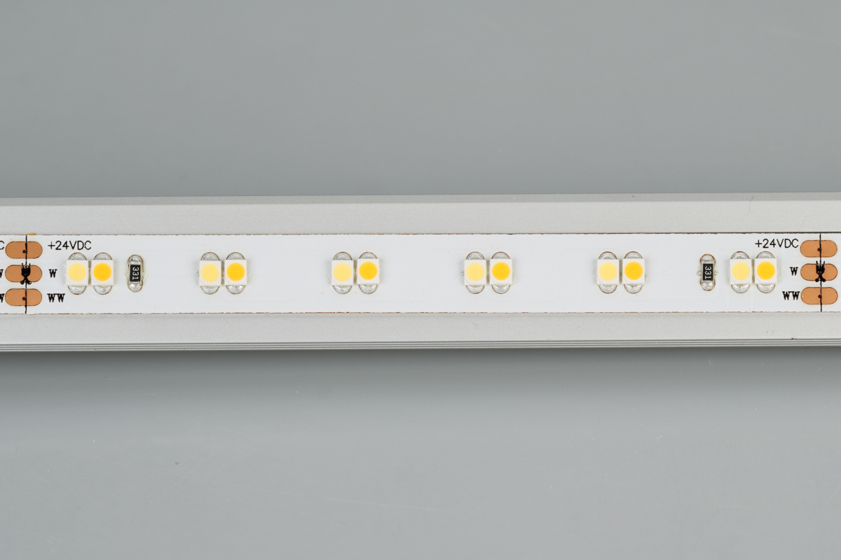 2-х канальная лента LUX с изменяемой цв.температурой, светодиоды smd 3528, 120шт/м (600шт на 5м), белая плата 10мм, скотч 3М. Два цвета БЕЛЫЙ 6500K + ТЁПЛЫЙ 2700K. Угол 120°, цветопередача CRI>90. Питание 24V, мощность 9,6 Вт/м (48 Вт на 5м). Размеры 5000х10х1,8мм. Мин.отрезок 100мм, 12 светодиодов. Цена за 1м.