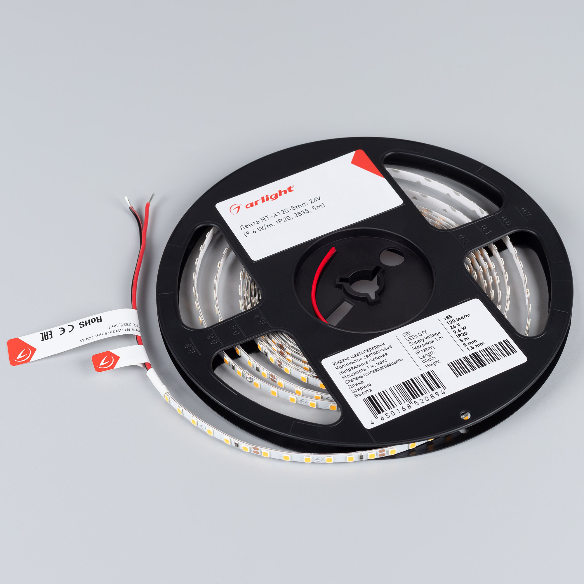 Светодиодная узкая лента RT серии A120 . Светодиоды SMD 2835, 120 шт/м, белая плата шириной 5 мм, скотч 3M. Цвет ТЕПЛЫЙ 2700K, индекс цветопередачи CRI>85, угол 120°. Питание 24 В, мощность 9.6 Вт/м (48 Вт на 5 м). Размеры 5000x5x1.5 мм. Мин. отрезок 50 мм, 6 светодиодов. Цена за 1 м.