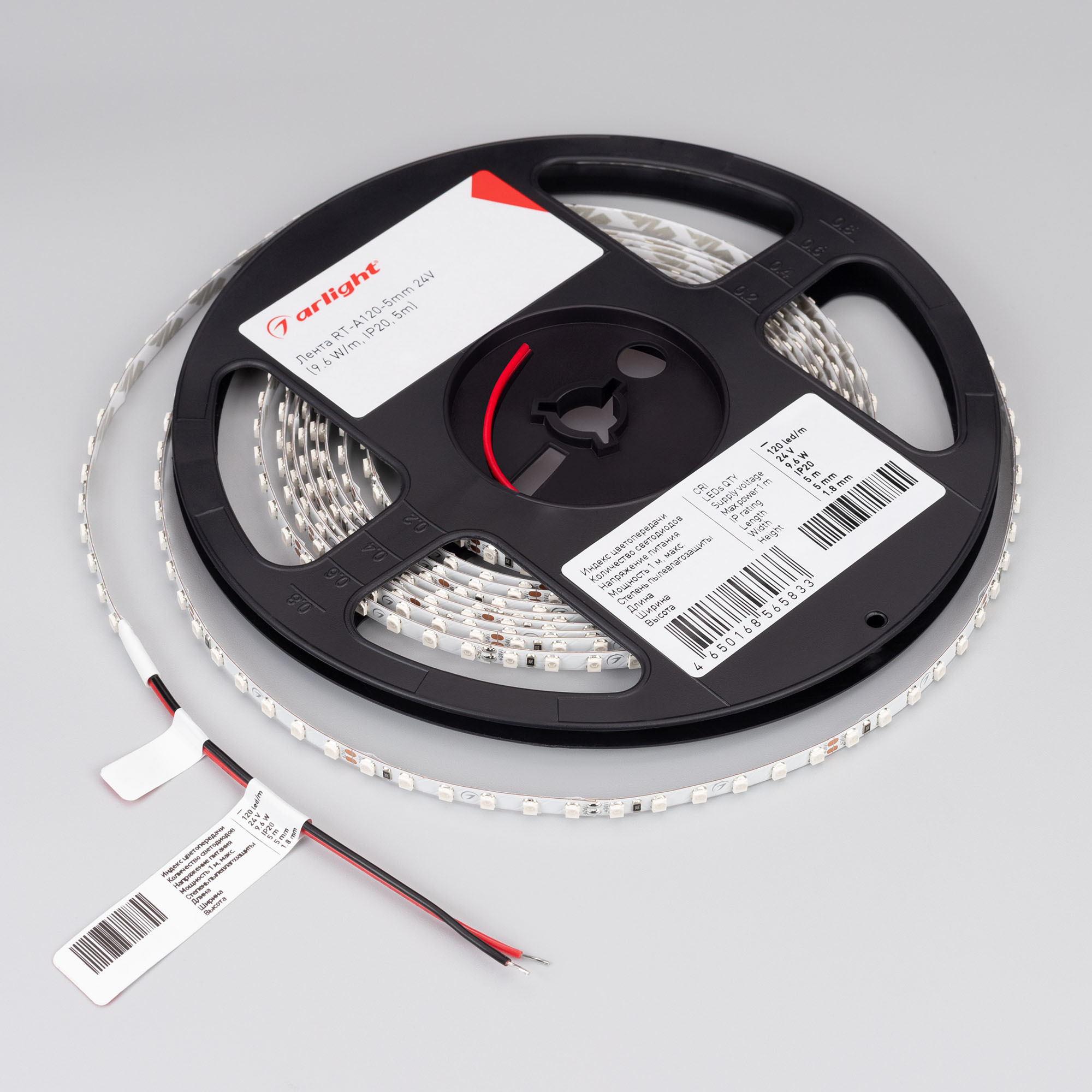 Лента RT-A120-5mm 24V Yellow (9.6 W/m, IP20, 2835, 5m) (Arlight, узкая)