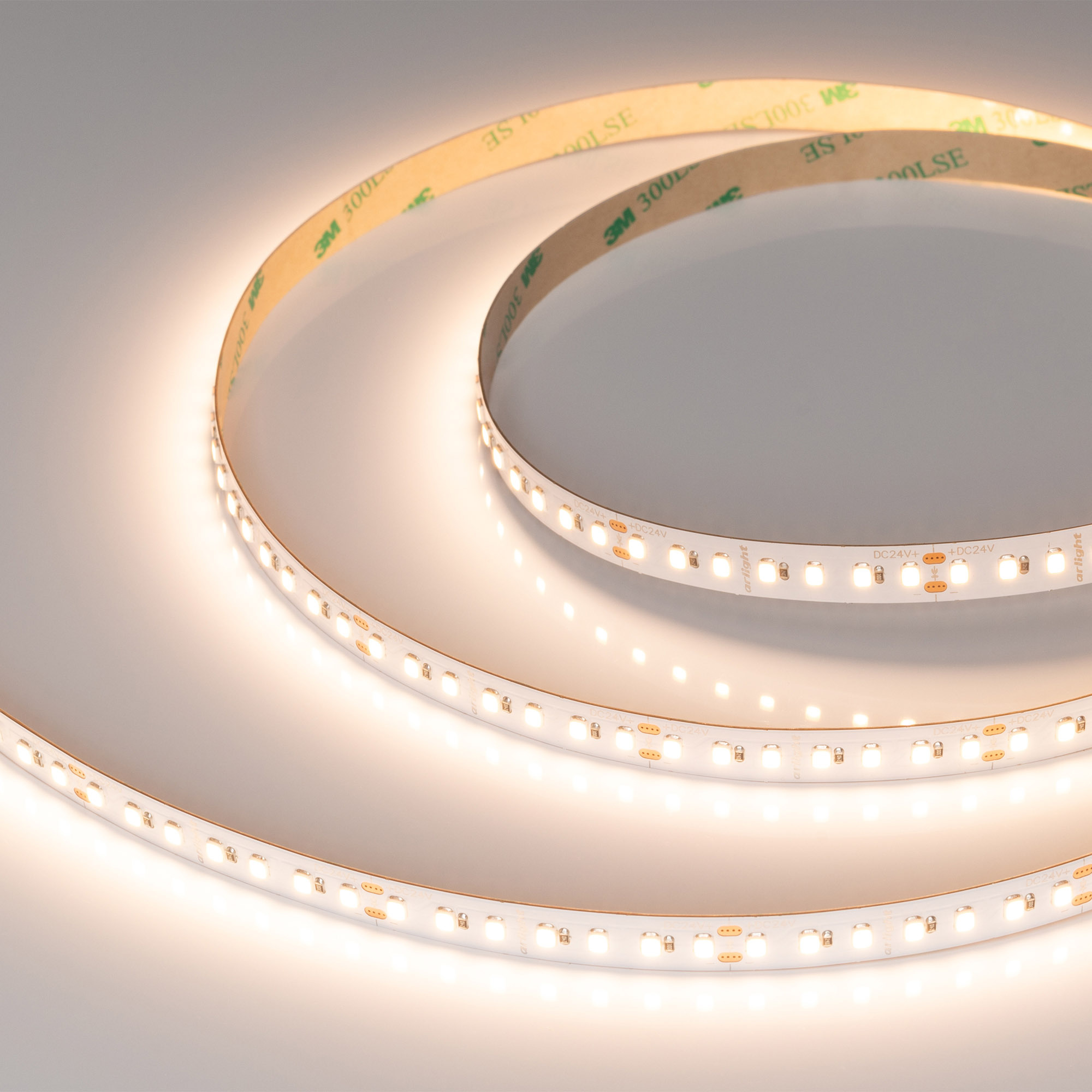 Светодиодная лента RT серии A140 с повышенной цветопередачей. Светодиоды SMD 2835, 60 шт/м, белая плата шириной 10 мм, скотч 3М. Цвет ТЕПЛЫЙ 3000K, индекс цветопередачи CRI>98, R9>90, угол 120°. Питание 24 В, мощность 20 Вт/м (24 Вт на 5 м). Размеры 5000х10.5х1.7 мм. Мин. отрезок 50 мм, 7 светодиодов. Цена за 1 м. Обязательна установка на профиль.