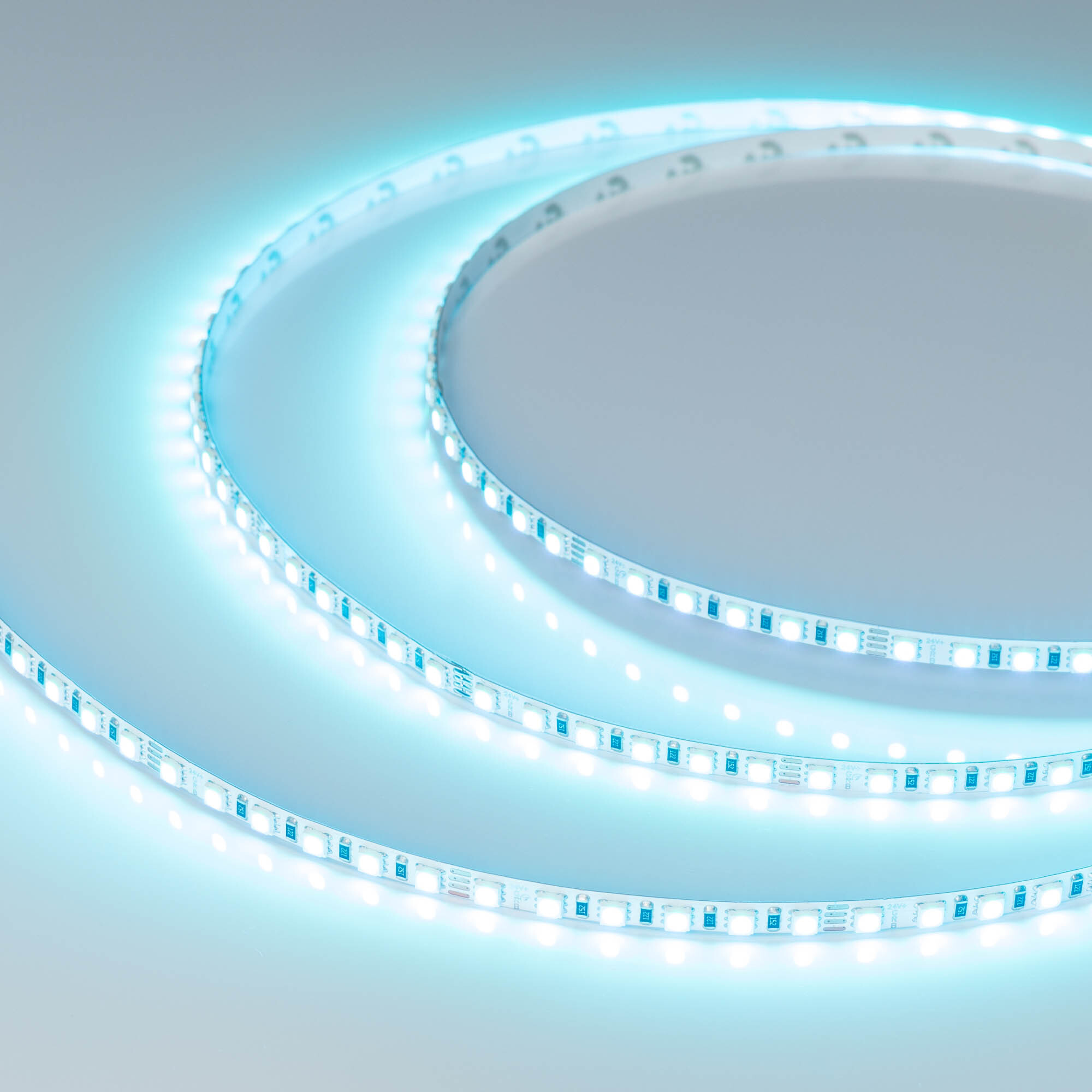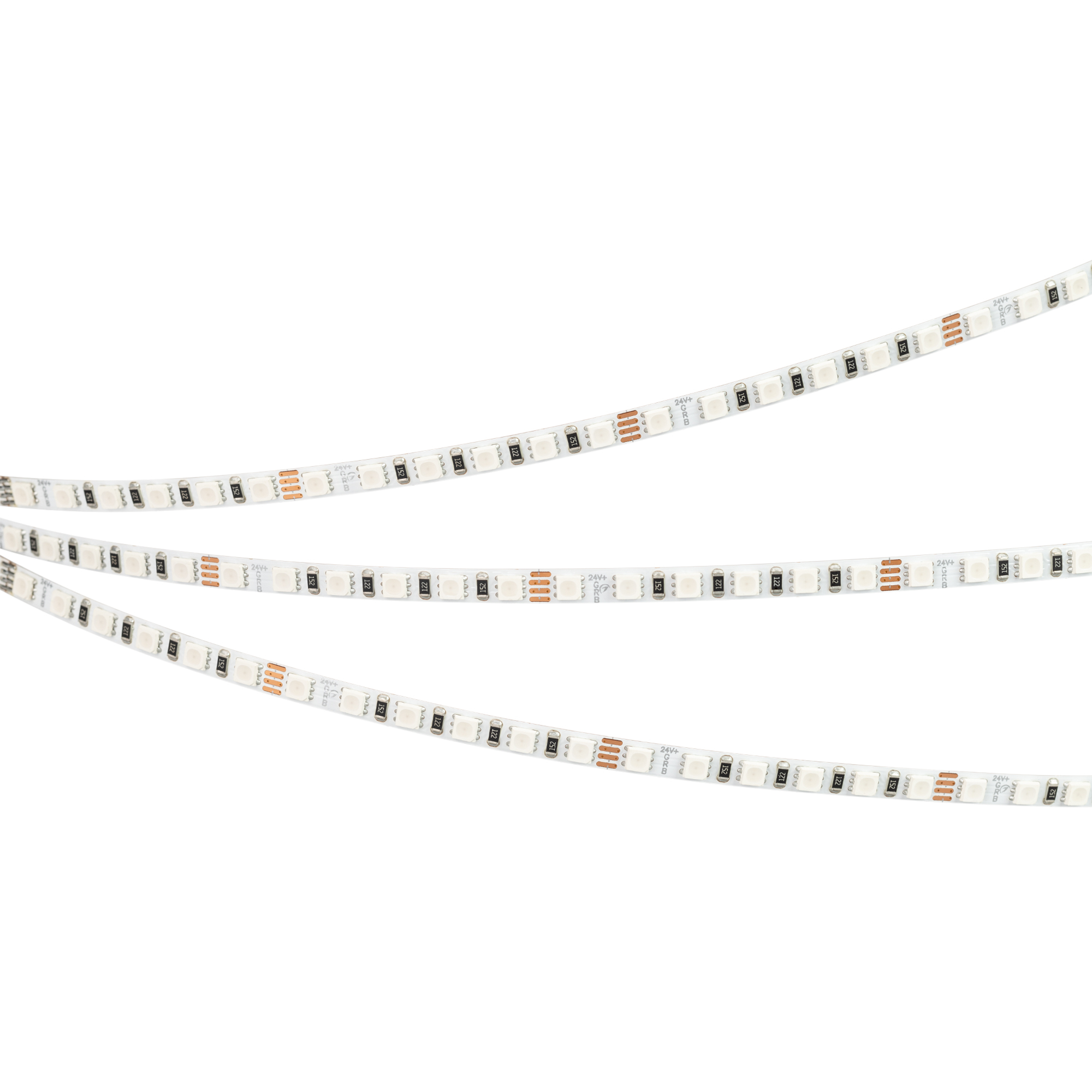 Мультицветная лента серии RT G120. Светодиоды SMD 3838, 120 шт/м, белая плата шириной 5 мм, скотч 3M. Цвет RGB. Питание 24 В, мощность 7.5 Вт/м (37.5 Вт на 5 м), угол 120°. Размеры 5000x5x1.9 мм. Мин. отрезок 50 мм, 6 светодиодов. Цена за 1 м. Обязательна установка на профиль.