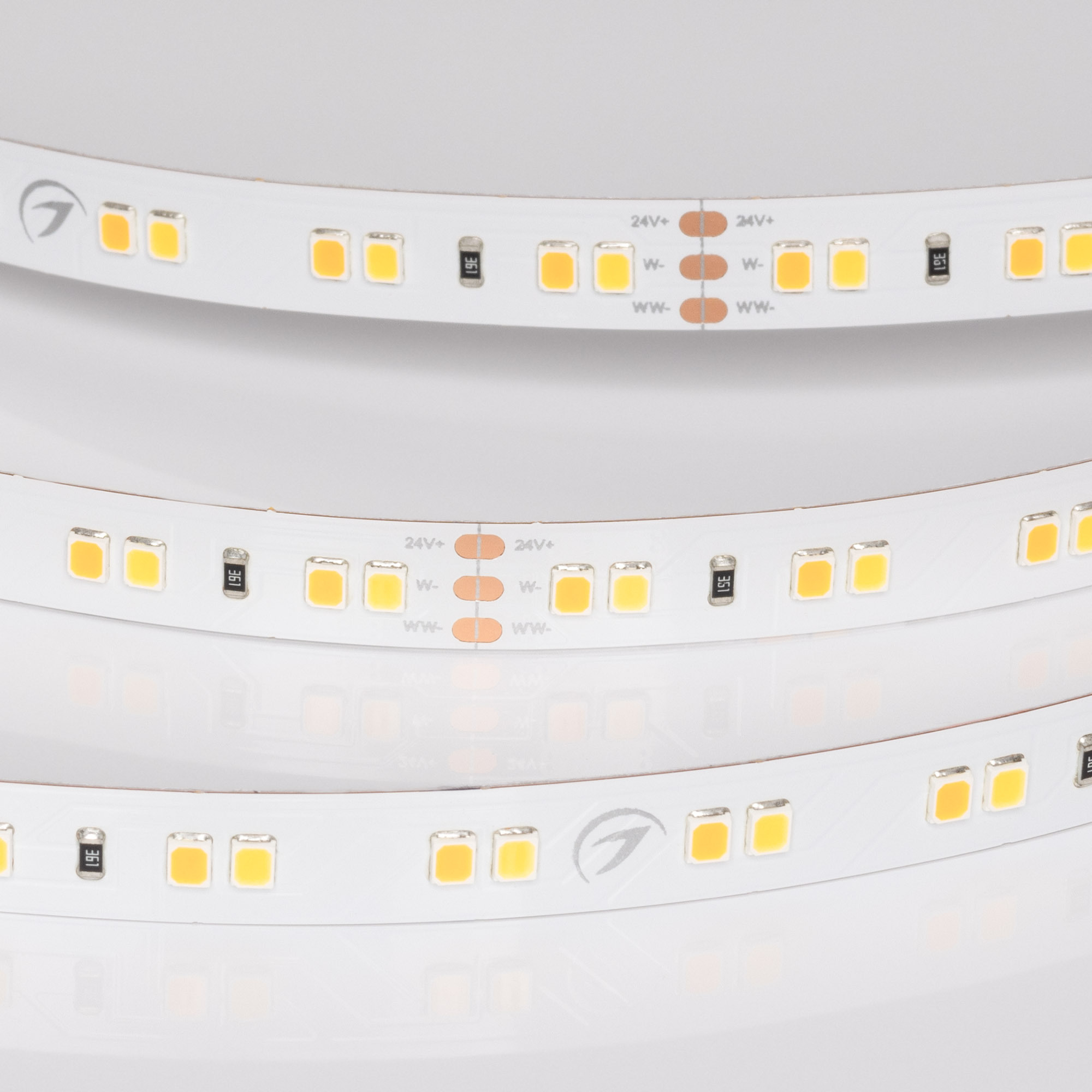 Светодиодная лента UL серии A120 с изменяемым цветом свечения. Светодиоды SMD 2835, 120 шт/м, белая плата шириной 10 мм, скотч 3M. Цвет MIX ДНЕВНОЙ 4000 K + ТЁПЛЫЙ 2400 K, индекс цветопередачи CRI>90, угол 120°. Питание 24 В, мощность 10 Вт/м (50 Вт на 5 м). Размеры 5000x10x1.8 мм. Мин. отрезок 100 мм, 12 светодиодов. Цена за 1 м.