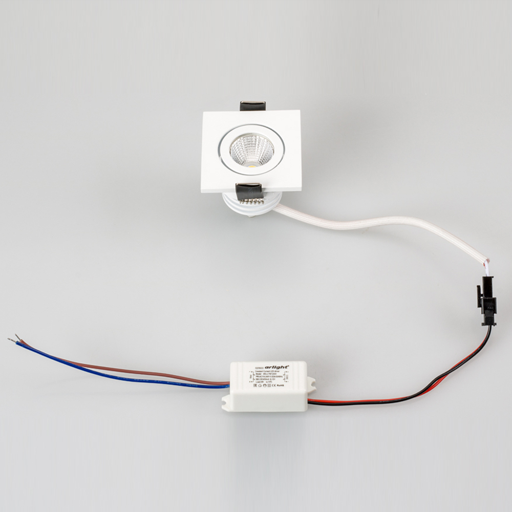 Врезной квадратный мебельный светильник 5Вт, корпус белый алюминий. Цвет ДНЕВНОЙ БЕЛЫЙ 4000K. Светодиод 1х5W Bridgelux. CRI>80, Св.поток 350-400лм, наклоняемая ось, угол 25°. Питание 180-240VAC, 5Вт, 400mA 11-13V, драйвер в комплекте. Размеры 50x50x50 мм, врезное отверстие d42 мм.