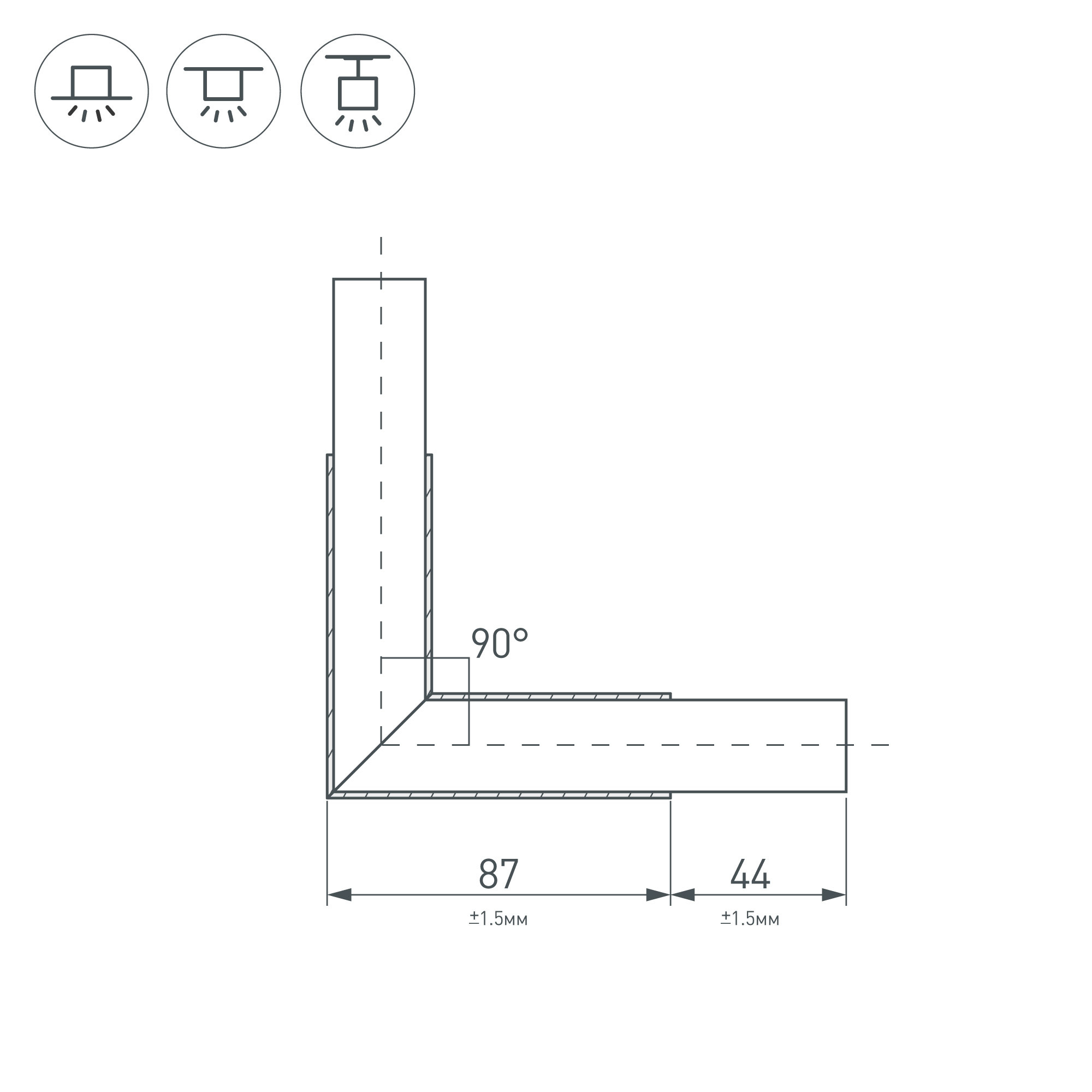 Прямой угол в сборе для соединения 2-х профилей PLS-LOCK-H25 BLACK под прямым углом 90°. Анодирование в черный цвет. Экран образует линию на плоскости. В комплекте матовый экран (арт.019189), соединители.