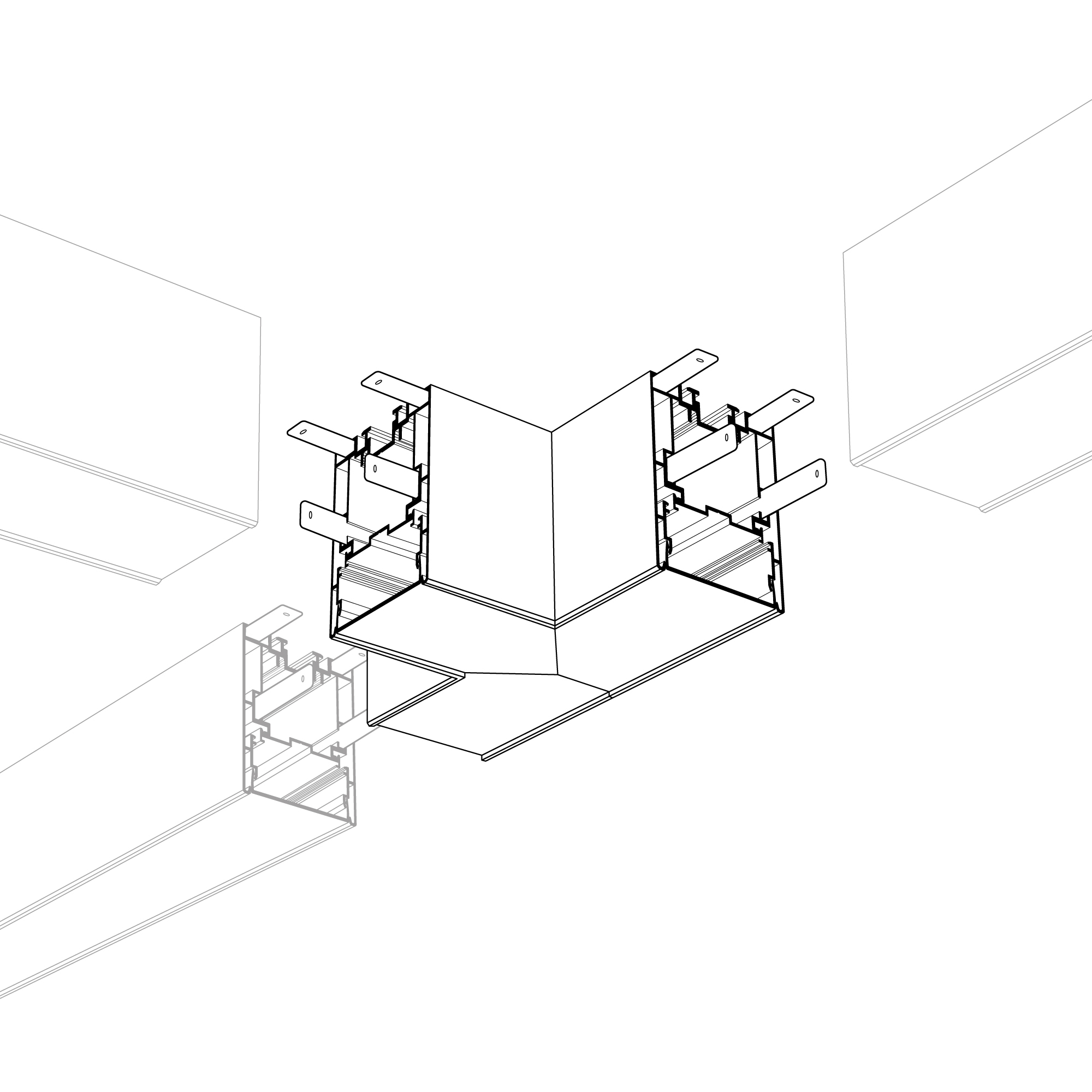 Тройной угол в сборе, для соединения 3-х профилей S2-LINE-5470 под прямыми углами 90°. Экран образует линию "Т" на плоскости. В комплекте матовый экран, площадка для ленты, соединители. Длина внешней стороны угла 150мм.