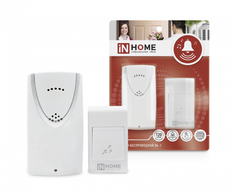 Звонок беспроводной полиф. ЗБ-1 32 мелодии 120м с цифр. кодир. с кнопкой бел. IN HOME 4690612013299