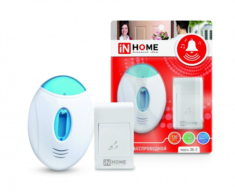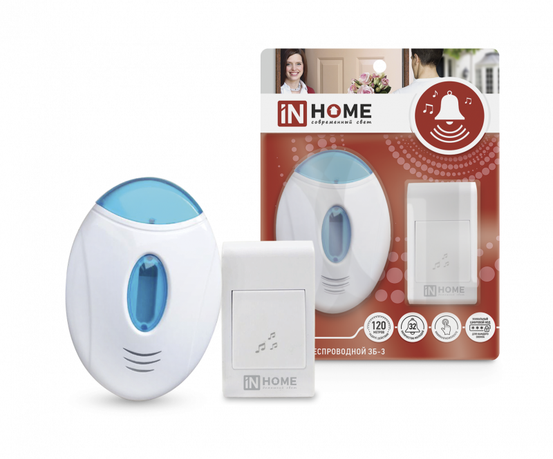 Звонок беспроводной полиф. ЗБ-3 32 мелодии 120м с подсветкой цифр. кодир. с кнопкой бел./голуб. IN HOME 4690612013312